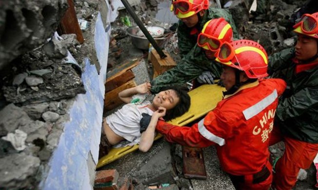 2008年5月13日,都江堰市聚源鎮(zhèn)中學(xué)救援現(xiàn)場(chǎng)。高瑩終于被救出。