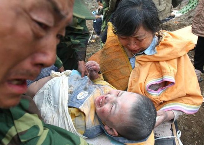 2008年5月13日,四川北川,小郎真的爺爺奶奶看見(jiàn)從從廢墟中的營(yíng)救出來(lái)孫子不禁失聲痛哭。