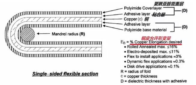 而且在不同的使用場合,同一材料的銅皮變形量取值也不一樣。對于一次性彎曲的的場合,使用折斷臨界狀態(tài)的極限值(對延碾銅,該值為16%)。對于彎曲安裝設(shè)計情況,使用IPC-MF-150規(guī)定的最小變形值(對延碾銅,該值為10%)。對于動態(tài)柔性應(yīng)用場合,銅皮變形量用0.3%。而對于磁頭應(yīng)用,銅皮變形量用0.1%。通過設(shè)置銅皮允許的變形量,就可以算出彎曲的最小半徑。