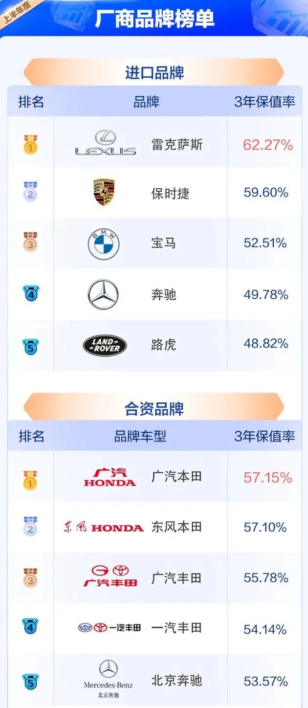 另外,在進(jìn)口品牌和合資品牌中,雷克薩斯和廣汽本田最保值,兩者保值率分別為62.27%和57.15%。報(bào)告指出,進(jìn)口品牌與合資品牌的保值率要高于中國(guó)品牌,其中日系車保值率占據(jù)領(lǐng)先地位。細(xì)分來(lái)看,進(jìn)口品牌雷克薩斯、保時(shí)捷、寶馬分別位列榜單分前3名,合資品牌依舊是日系車占主導(dǎo)地位,榜單中前4名均為日系品牌,排名第5名為北京奔馳,保值率為53.57%。