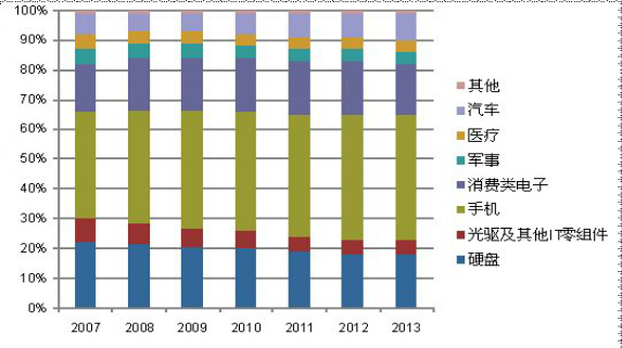 隨著社會的不斷進(jìn)步,人們對物質(zhì)的需求促使消費(fèi)類產(chǎn)品的不斷更新?lián)Q代,當(dāng)然這促使全球消費(fèi)電子進(jìn)入了一個輕薄多樣化的時代,這也給柔性電路板廠帶來越來越多的市場空間。但我們卻很少有人知道FPC在消費(fèi)類電子市場中哪些行業(yè)的市場占比相對多一些。以下圖表是2007-2013年FPC在各行業(yè)的市場份額波動圖: