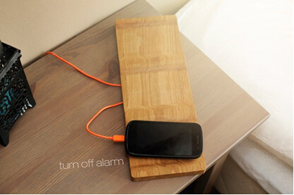 而Tangible Alarm的設(shè)計(jì)Tangible Alarm就像一塊長(zhǎng)條形的木板,可以無(wú)線同步手機(jī)鬧鐘,通過簡(jiǎn)單的移動(dòng)手機(jī),完成各種鬧鐘狀態(tài)的操作。Tangible Alarm共有三個(gè)移動(dòng)的位置,包括小睡移動(dòng)到右側(cè)、關(guān)閉移動(dòng)到左側(cè)以及中間即是當(dāng)前鬧鐘設(shè)置狀態(tài)。