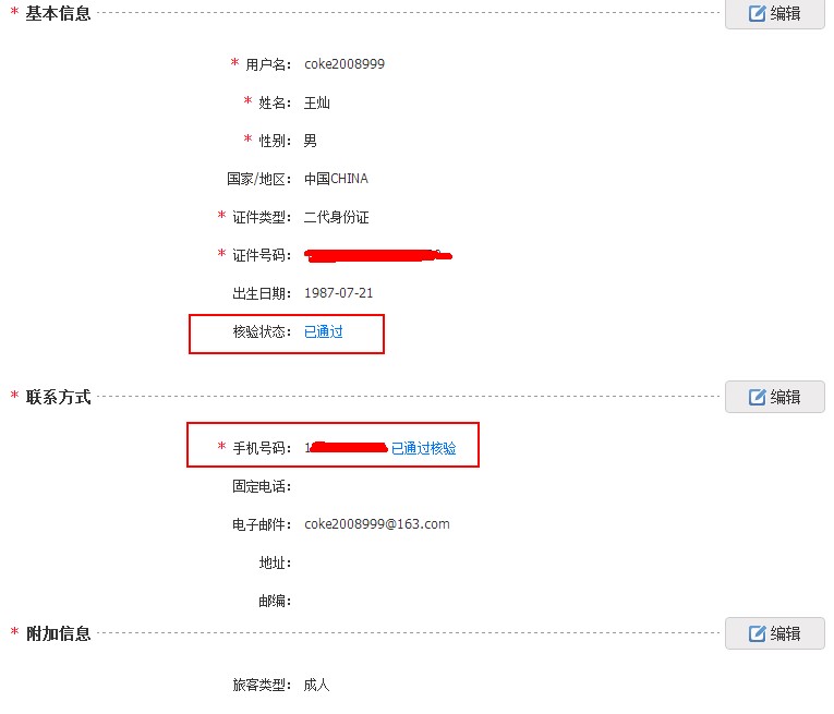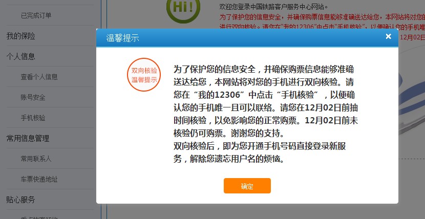 確定后,有可能會(huì)跳出如上圖讓您手機(jī)核驗(yàn)的,不用理他就好。繼續(xù)點(diǎn)入“我的12306”-“個(gè)人信息”看看是否核驗(yàn)成功,成功后如下圖。