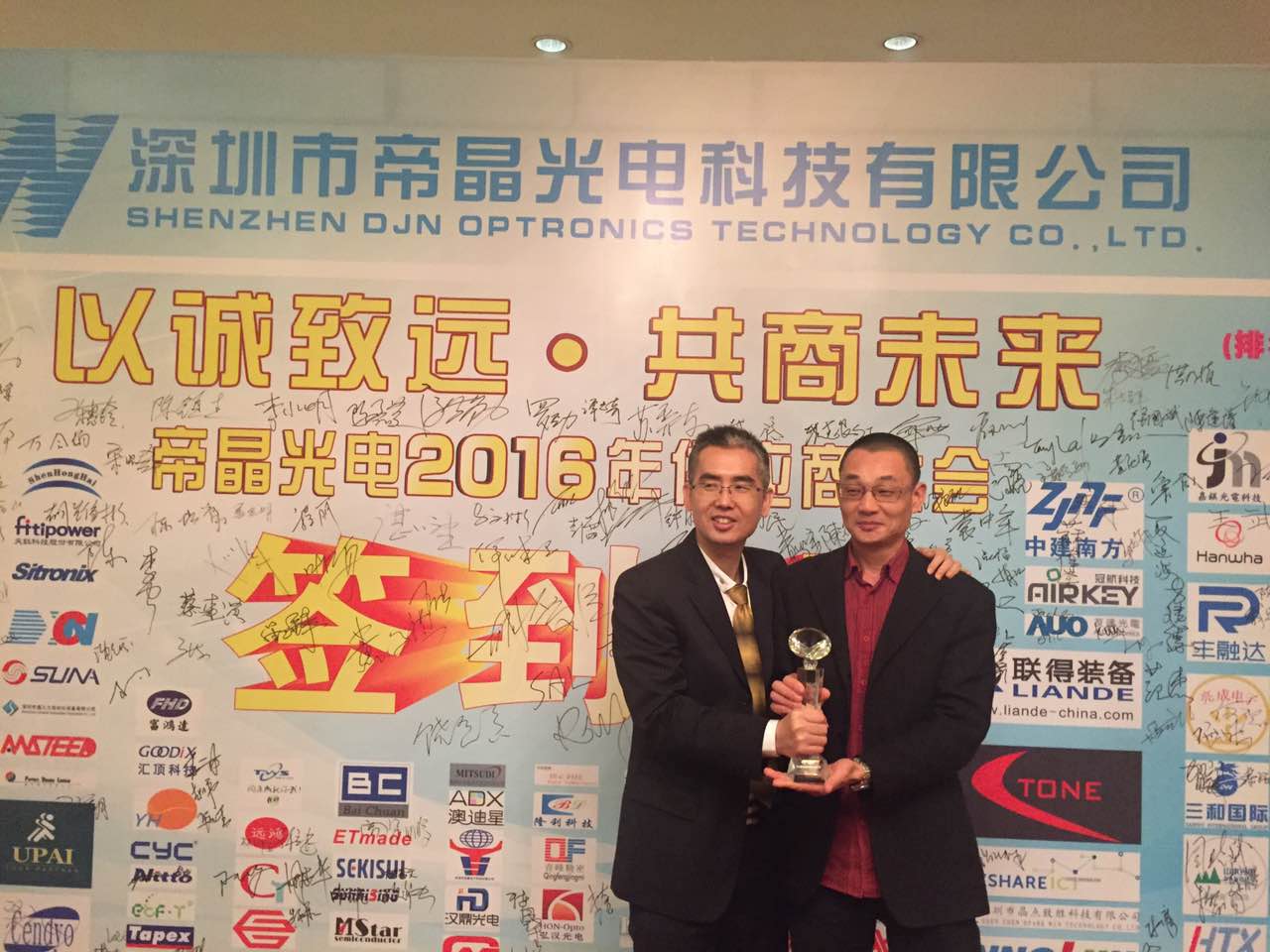 會上,帝晶光電陳總、蘇總為供應(yīng)商們頒獎,深聯(lián)電路文總上臺領(lǐng)獎!