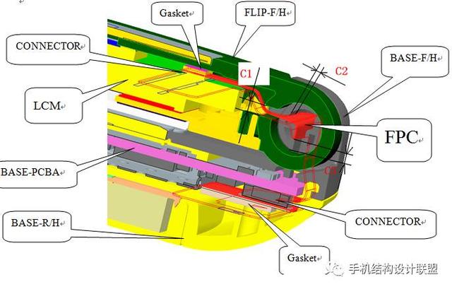 (ii) BASE-F/H處過FPC孔槽,其尺寸大小一般以能夠通過CONNECTOR以及FPC為基準進行尺寸確定,其軸肩過FPC槽以不磨損FPC為前提,留出>0.4mm間隙考量設(shè)計尺寸即可。
