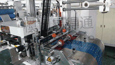 1、放料機放料藍色托底離型膜,(注意:此處離型膜為覆合后的雙層離型膜)托底離型膜由主機進料架進入上異步模切機,經(jīng)過沖切平臺再進入拉料系統(tǒng)。