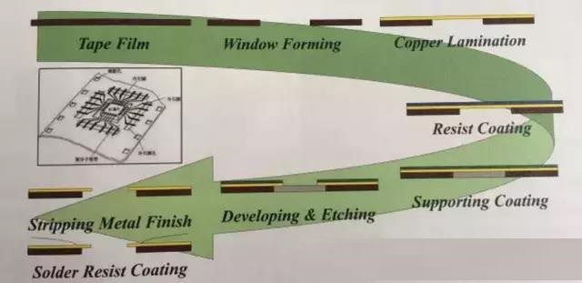 這種軟板結(jié)構(gòu)的制作方法,一般會采用基材涂附膠合樹脂,之后進行沖壓去處空區(qū),接著再進行銅皮壓合程序。這種做法由于需要組裝接合的區(qū)域,兩面都有銅皮暴露出來,因此組裝上不成問題。但是因為后續(xù)要進行線路制作,這些無支撐區(qū)域失去了基材的支撐,無法進行濕流程線路蝕刻,因此必須要增加一道保護膠涂裝程序,再進行線路制作。在線路完成后,必須將保護膠去除才能進行金屬表面處理,因此執(zhí)行程序就較為繁復(fù)。這類產(chǎn)品目前以TAB類產(chǎn)品為典型代表,如下圖。