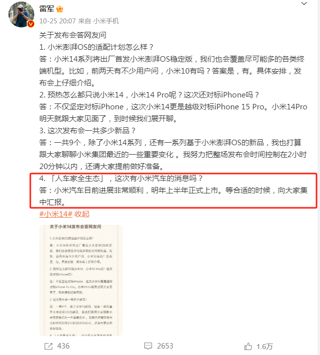10月25日,小米集團(tuán)創(chuàng)始人、董事長兼CEO雷軍在微博透露,小米汽車進(jìn)展順利,將在2024年上半年正式上市。